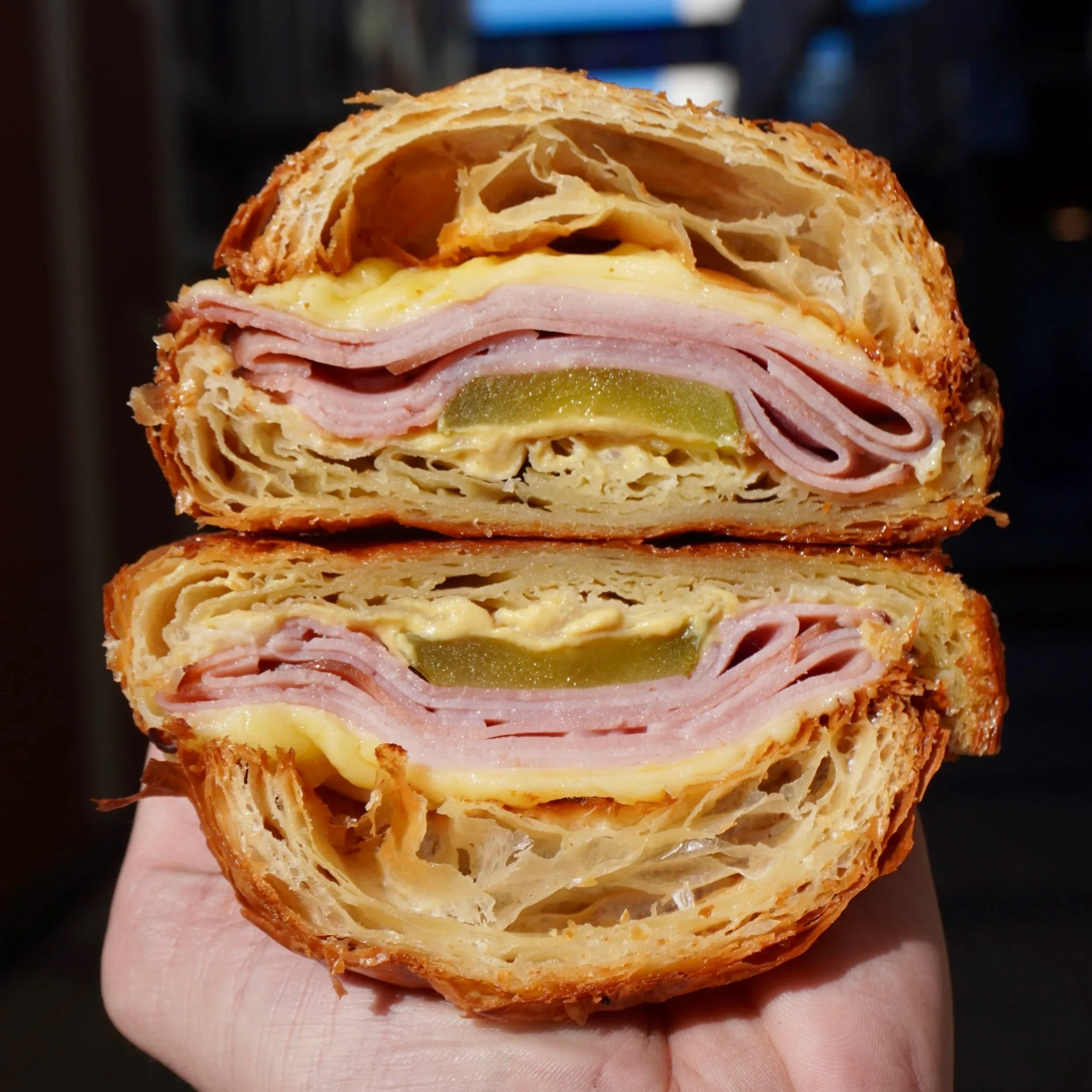 Ham and Cheese Croissant with Mustard and Pickles, Salami and Pesto Toastie, Mushroom Ragu Toastie, Buffalo Chicken Toastie